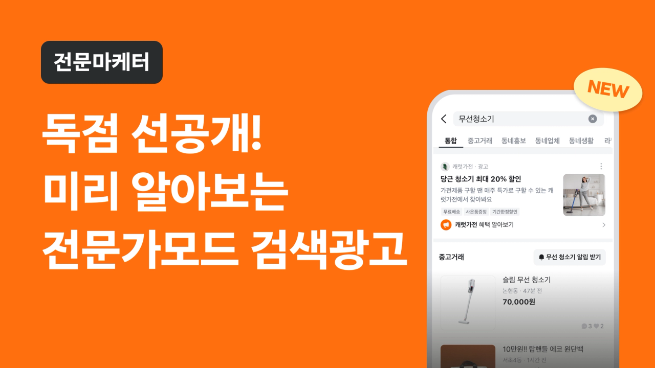 이번 웨비나에서는 10월 20일 당근에서 새롭게 런칭되는 검색광고 상품에 대해서 자세히 알아보고, 실제 검색광고를 통해 성과 개선에 성공한 마케터가 직접 운영 노하우를 소개해 드릴 예정이에요.